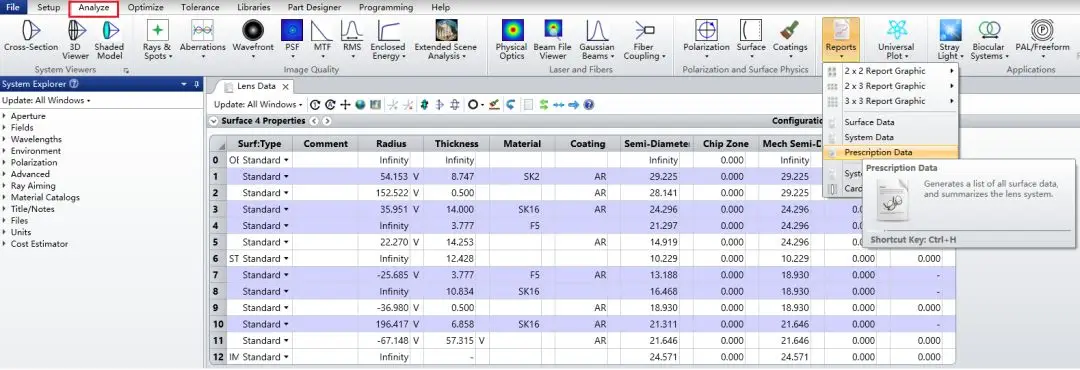 为了在透镜数据编辑器和布局图中显示入瞳和出瞳面,我们需要在透镜编辑器中插入虚拟面来模拟光瞳的位置。本文使用 OpticStudio 自带的 Double Gauss 28 degree field.ZMX 文件作为示例,该文件位于 Zemax 根目录下 Samples > Sequential > Objectives 文件夹中。对于序列系统,您可以在分析 (Analyze) 选项卡 > 报告 (Report) > 详细数据 (Prescription Data) 的报告中查看系统光瞳的数据。