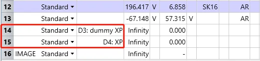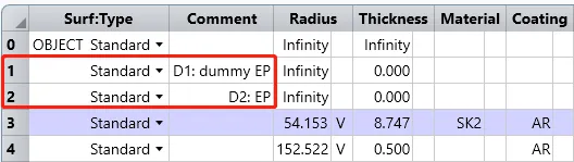 在开始设置之前,我们需要插入四个虚拟面,其中两个面在表面1之前,两个在像面之前。本文将以 D1-D4 表示这些表面: