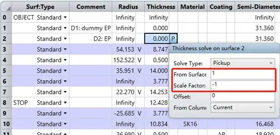 在开始实际计算之前,我们首先需要对这些表面进行设置。分别设置 D2 和 D4 表面厚度的求解类型为拾取,使其分别拾取 D1 和 D3 的厚度,并设置缩放比例为-1。完成后您将会看到厚度参数的求解类型标记为 “P”: