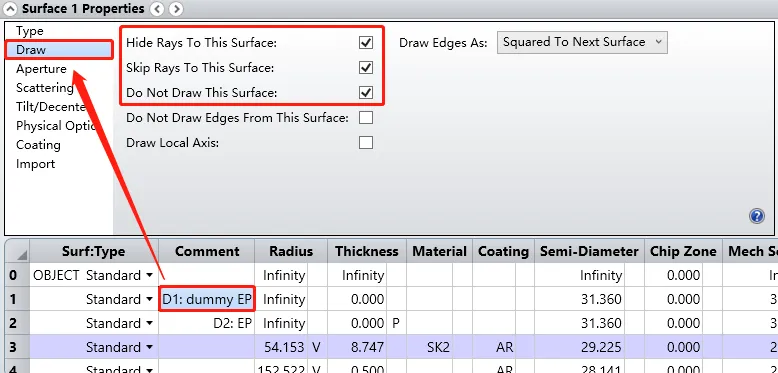 然后我们需要设置这四个表面及 D2 的下一个表面(下表标记为 D2+1)的表面属性 (Surface Properties),以使 OpticStudio 只画出这些表面而不画出经过这些表面的光线。您需要在表面属性中的绘图 (Draw) 选项卡中进行如下设置: