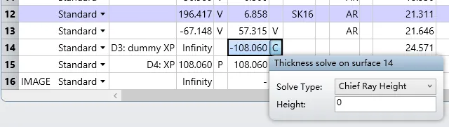 现在让我们先设置比较容易的出瞳面位置。您只需要选中 D3 面,设置该表面的厚度求解类型为主光线高度 (Chief Ray Height) 并保持高度值为0。设置完成后该厚度参数后会出现标记 “C”。此时主光线的参考球面的曲率半径与出瞳面的厚度相同。因此您可以设置 D4 面的曲率半径拾取 D3 面的厚度并设置缩放比例为-1: