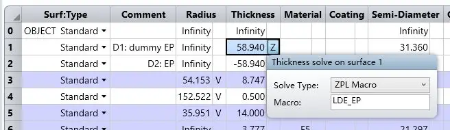 选中表面 D1,设置厚度求解类型为 ZPL 宏 (ZPL Macro) 并在宏名称一栏输入 “LDE_EP” (输入时不带引号),需要注意的是该宏程序并非只能用于当前系统,还可以应用到其他系统之中: