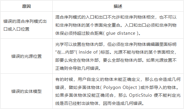 当 Optic Studio 不知道下一步该如何追迹光线的时候,便会产生几何错误。常见的原因是物体或者表面的构建或者位置摆放有问题。具体包括: