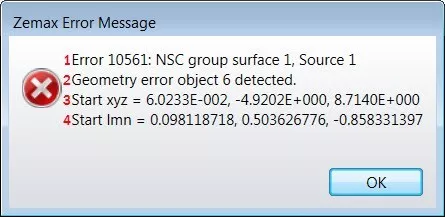 在非序列模式或者混合序列模式中( Mixed Sequential/Non-Sequential Mode),都可能会遇到几何错误。几何错误会在光线遇到几何体的某些区域并无法继续追迹的情况下。这些错误会在软件界面上弹出,并且同时写入光线数据库用于后期分析。事实上,看到这些错误未必证明系统有问题,相反,这些错误提示是用来告诉用户更多的信息。分析这些错误信息可以让人确信系统建模的正确性。