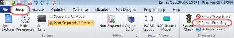 每当几何错误发生时,OpticStudio 会储存那根光线的起始点坐标和方向余弦。这些信息可以用来创建一根光线来复盘之前的几何错误。当几何错误发生之后,您可以让 OpticStudio 生成一个光线光源来作为错误光线。方法如下:Setup > Create Error Ray: