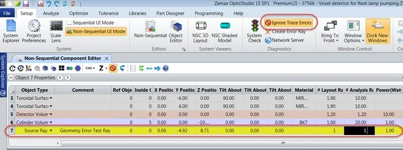 点击这个按钮之后,OpticStudio 便会自动在非序列物体编辑器里面根据相应的坐标和方向余弦生成光线光源,同时把其他光源的分析光线条数和陈列光线条数同时设为0。当用以分析几何错误的光线建立之后,您就可以通过布局图,光线数据库查看器等功能来分析诊断造成几何错误的原因。在分析的时候,建议临时开启“忽略追迹错误”,以避免 OpticStudio不断地报告错误: