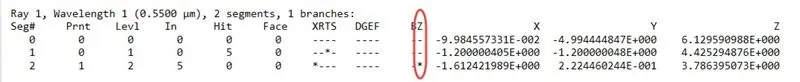 在光线数据库里(分析>光线追迹分析>光线数据库查看器),您可以查看光线传播的详细情况,并方便地找到光线在何处发生了错误(在 Z 列中用*标记)。用这个方法您可以看到光线发生错误时所在地物体序号、物体的表面序号,以及完整地光线传播路径。如果要对模型进行修改以避免错误,这个技巧便十分重要。