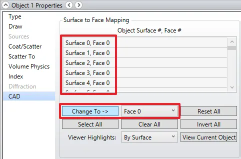 选择好需要的面之后,我们就在Object Properties中的下拉式选单中选择“Face 1”,然后点一下Change To -> ,这样就可以把选取的面都设为Face 1。现在,我们的对象仅包含两个Face,每个不同的Face都可以独立指定不同的镀膜以及散射特性。