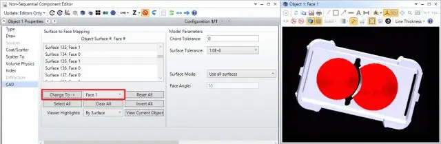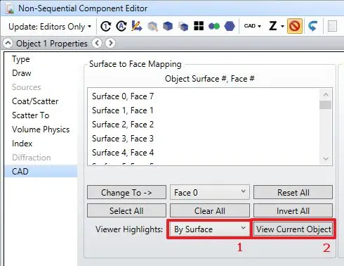 最后再点一下Clear All,这样将会没有任何一个面被选择。现在对象上所有的Surface都有同一个Face编号。但我们要把透镜的抛光表面设为其他的Face编号,这里假设我们要设置为Face 1。在Object Viewer中,左键点击选择Surface,被选择的Surface会同时在Object Viewer以及Object Properties里面高亮起来。