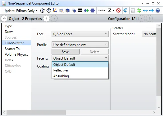 - 如果选择“Object Default”,则该Face的反射率由该对象玻璃材料的折射率、该Face另一侧的物质折射率、Face上面的镀膜(稍后更多细节)、入射光波长、偏振态以及入射角决定。也可在该Face上定义散射属性。