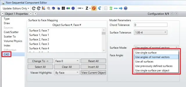 很明显,没有人会真的想去给这178个CAD Surface逐个设置表面属性!而且和其他CAD文件相比本文CAD文件中的Surface算少了。在OpticStudio中,选项“Surface Mode”可以帮助使用者根据一定的规则快速分类已知Face。“Surface Mode”可以在Object Properties > CAD中找到(只有在外部导入CAD文件时可以看到),Face Mode提供以下几种选项: