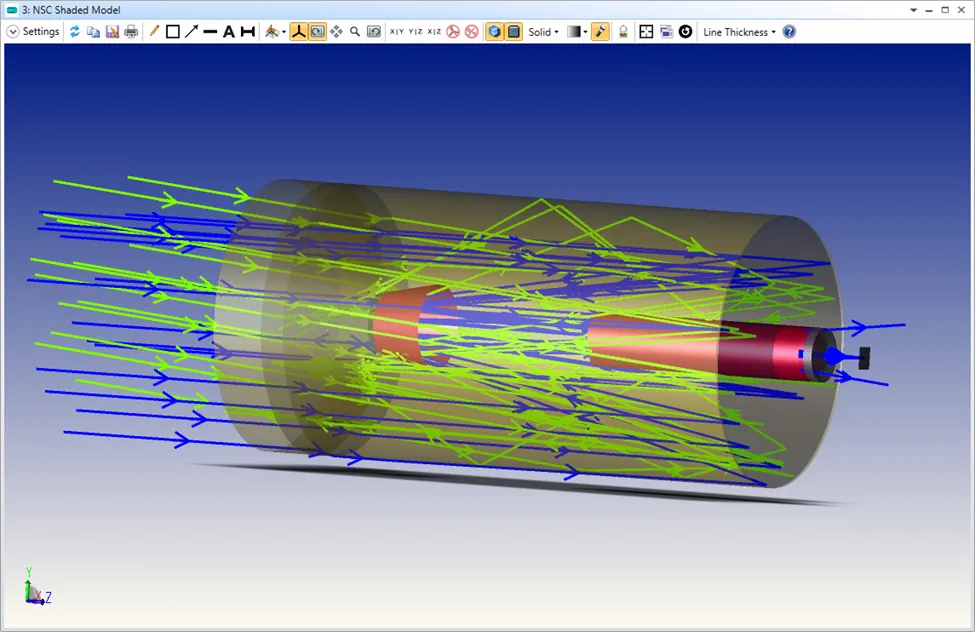 望远镜模型中的月亮用离轴的椭圆光源表示。月亮近似为一个准直光源,因此来自月亮(上图绿色部分)的光线彼此平行。类似地,感兴趣的观察对象用轴上的准直椭圆源表示。与典型的卡塞格林式望远镜设计一样,准直光线(上图中的蓝色光线)从轴上视场聚焦到像平面上形成一个良好的点。然而,一些光线(来自月球和恒星)没有经过期望的光学表面顺序,但仍能到达探测器。