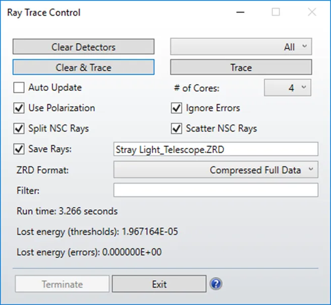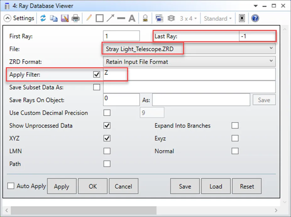 通过适当地调整第一条光线和最后一条光线字段,过滤器可以应用到保存的数据库的一小部分。或者,如果将最后一条光线设置为初始光线追迹中启动的光线的总数,则会处理整个数据库(或者,您可以简单地在最后一条广线字段中输入一个负值,例如-1)。