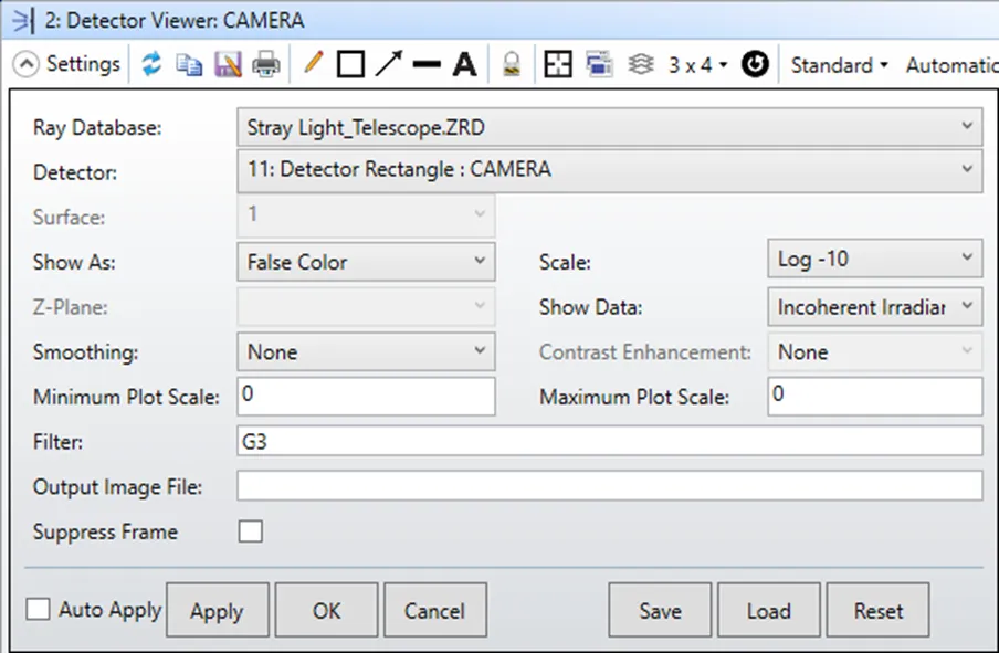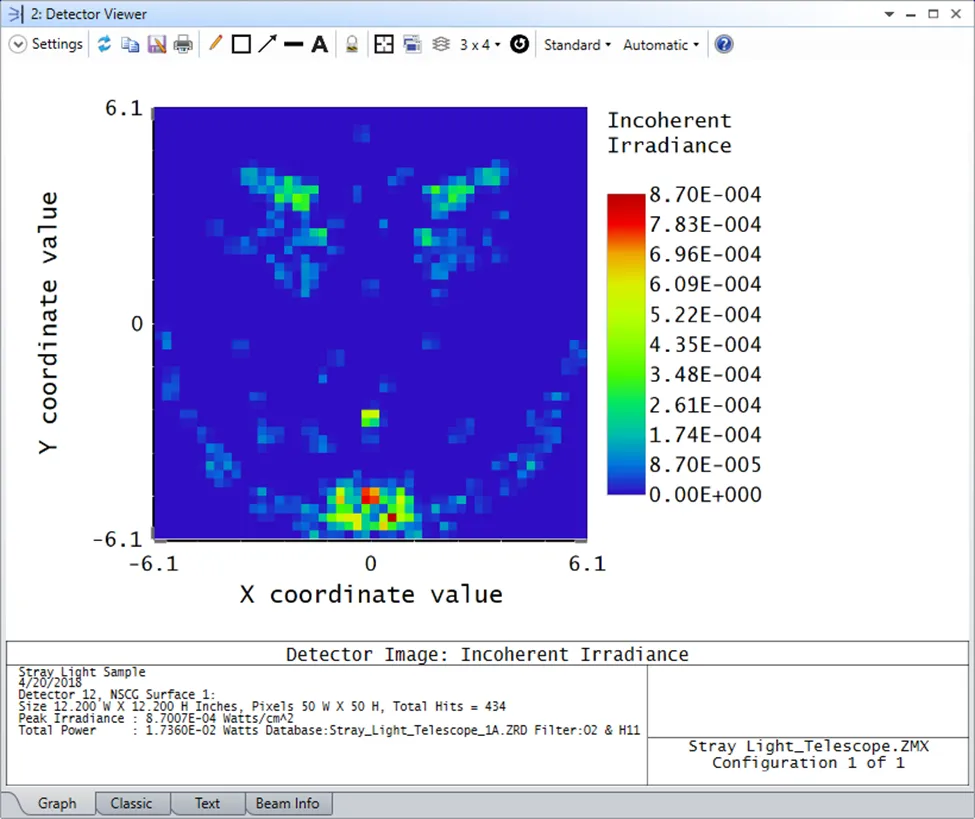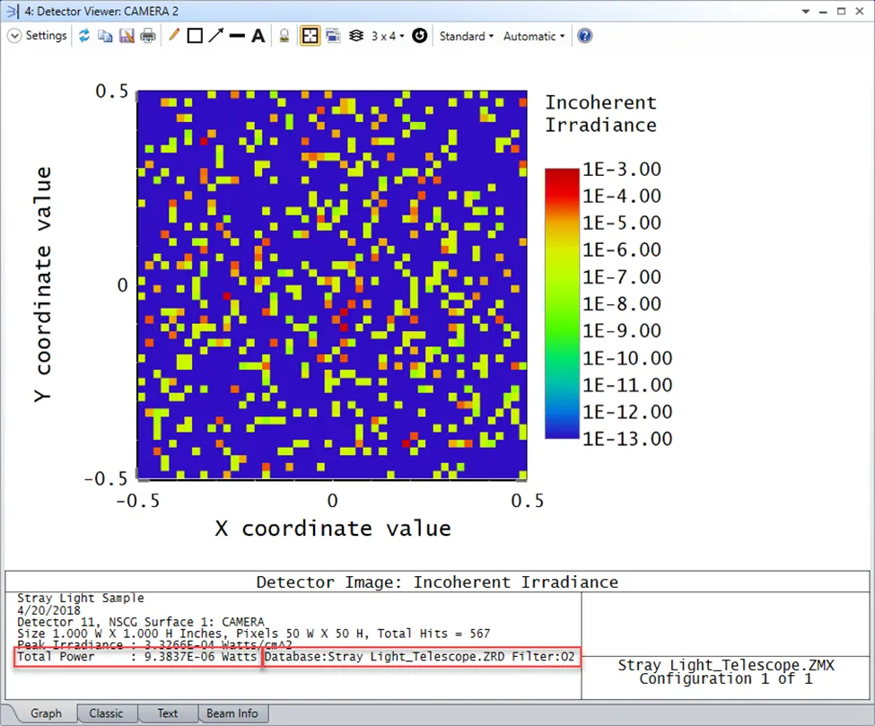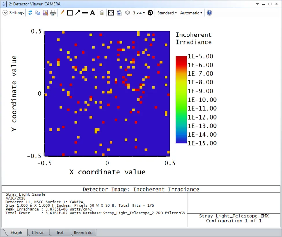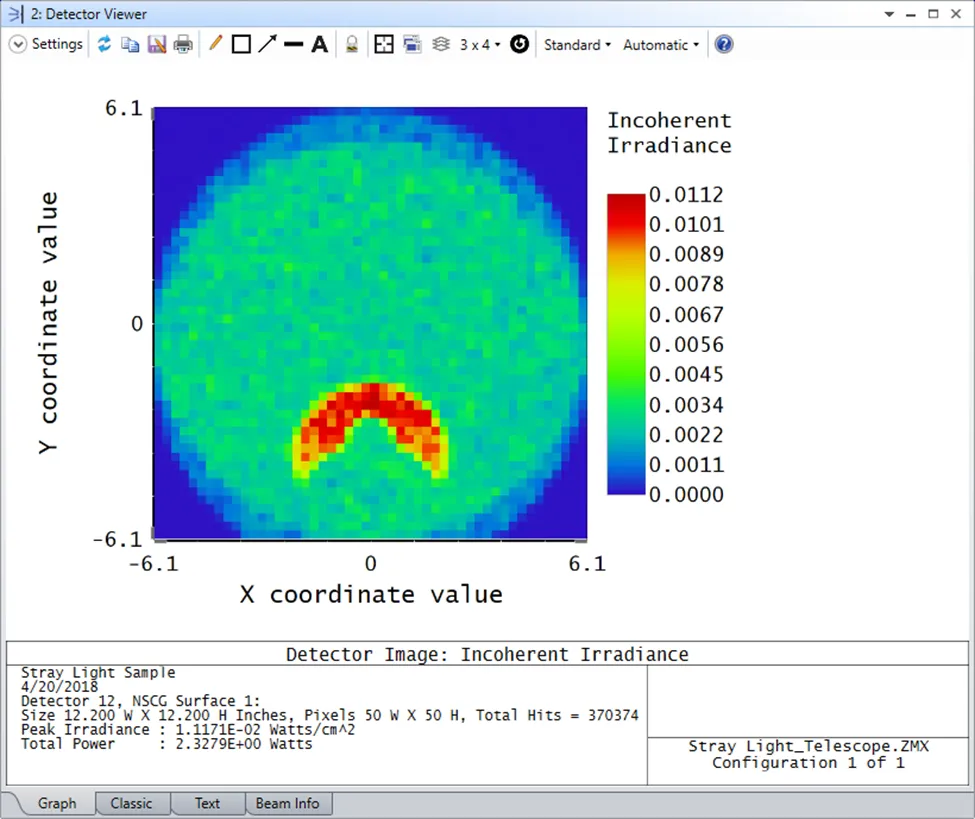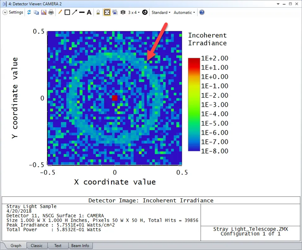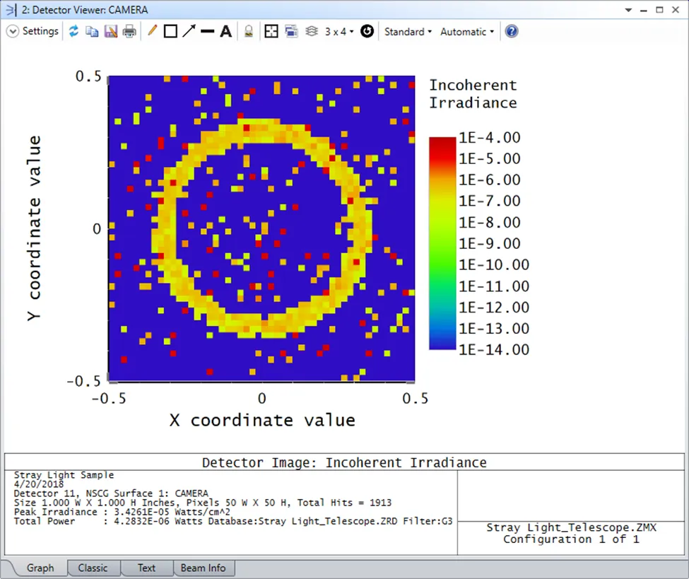 一旦光线追迹完成,确保在探测器查看器中选择合适的ZRD文件,并应用相同的鬼影过滤器G3。通过涂覆校正透镜,我们有效地消除了射线的伪“环”,并将总“鬼影”能量降低了一个数量级。
