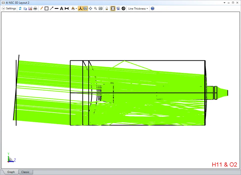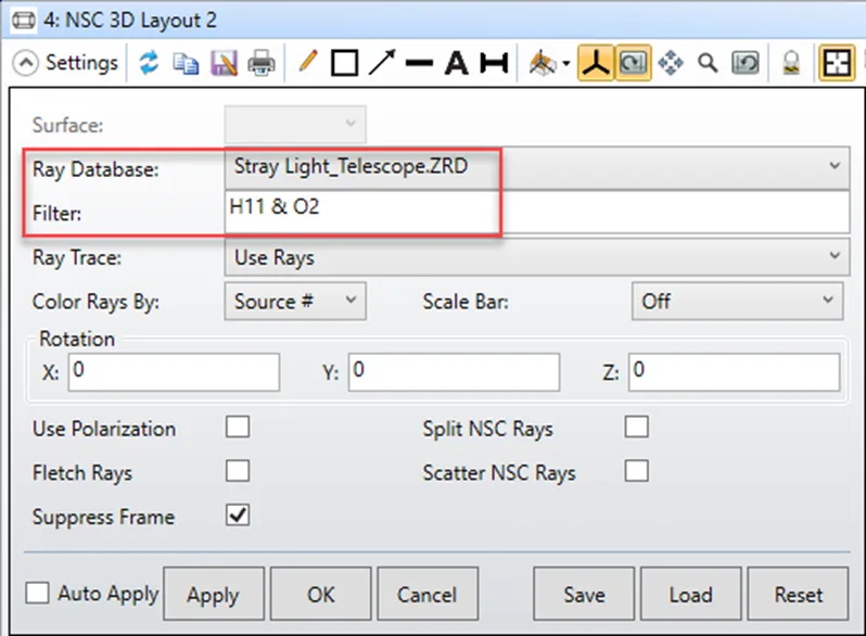 你可以想象,第11号探测器并不适合回答这个问题。然而,正如前面提到的,过滤字符串也可以应用于布局图。在当前的示例中,打开NSC 3D布局图的设置,再次从光线数据库下拉菜单中选择先前保存的ZRD文件。在布局中显示整个射线数据库将变得过于拥挤,无法执行任何实质性的分析,所以我们将在一会应用一个适当的过滤器。