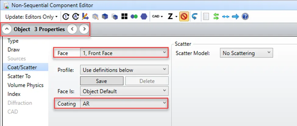 打开对象3的对象属性对话框,在校正器的正面和背面都放置一个抗反射(AR)涂层。这是针对当前初级波长优化的单层MgF2涂层。