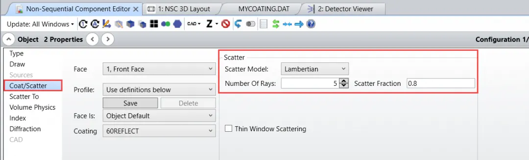 可以看到我们已经在 OpticStudio 中完成了部分反射和散射表面的创建。在本例中使用的工具和概念可以应用到更复杂的系统之中,其中使用到的定义膜层和散射属性的基本方法都是相同的。