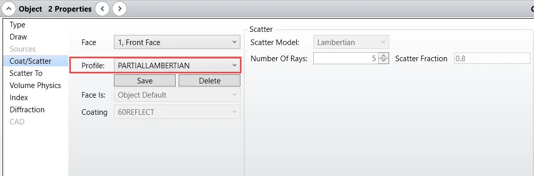 通过设置理想膜层以及定义特定的散射属性,我们可以在 OpticStudio 中定义部分反射和散射的表面。在 OpticStudio 非序列元件编辑器中的物体属性中的膜层/散射选项卡下,您可以在物体的不同表面上定义不同的膜层和散射属性。