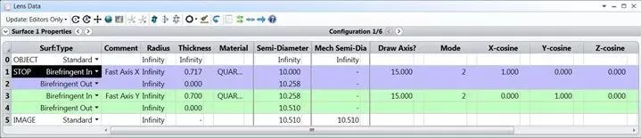 在OpticStudio中模拟双折射材料的方法于琼斯矩阵和表面镀膜不同。如果想要在序列模式下定义双折射元件,您必须在透镜数据编辑器中定义两个表面,即双折射输入表面和双折射输出表面。在这两个表面定义的边界之内,OpticStudio会使用两种材料,一种以双折射材料的寻常折射率来定义,另一种以非寻常折射率定义。