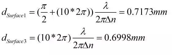 需要注意的是,透镜数据编辑器中定义了一个级数为10的四分之一λ波片(紫色表示),和一个级数为10的零相位延迟波片(绿色表示)。两种波片组合的等效效果为一个零级四分之一波片。两个波片的厚度可由下式进行计算: