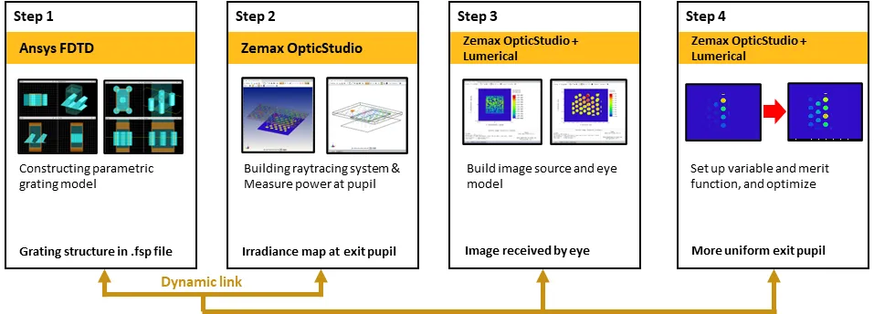 此示例显示了设置和模拟出瞳扩展器 (EPE) 的工作流程,EPE 是波导型增强现实 (AR) 设备的重要组成部分。该工作流程将利用 Lumerical 和 Zemax OpticStudio 之间的动态链接功能。为了使用动态链接,在Lumerical中构建了二维六边形圆柱体和一维倾斜光栅的参数化模型。另一方面,整个成像系统内置于Zemax OpticStudio中。在光线追踪过程中,当光线照射到光栅上时,Zemax OpticStudio 会自动调用 Lumerical 来计算精确的电场响应,从而可以对系统进行准确评估。