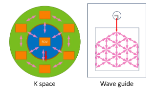 EPE是基于波导的AR系统(如Microsoft Hololens)中最流行的技术之一。它包括一块薄玻璃板(波导),上面有几个光栅。光栅的周期、区域形状和周期方向通常在 k 空间中规划。K 空间是一个二维空间,该空间中的任何单个点始终表示射线传播方向。当衍射光栅改变光线的传播方向时,它在该 k 空间中的位置会被矢量移动,其中矢量的长度与周期有关。K-space是一个非常有用的概念,用于规划EPE系统的光传播和光栅周期。