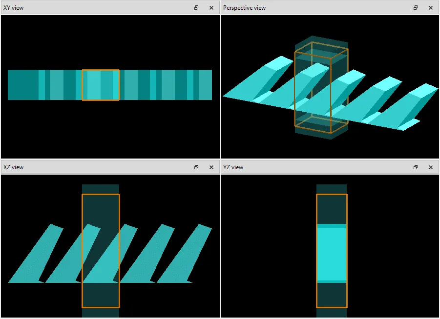 光栅模型首先在 Lumerical 中构建并保存在 .fsp 文件中。我们将需要两个光栅模型。一种是一维光栅,用于耦合来自光源的光。一种是用于耦合光线的 1D 光栅。