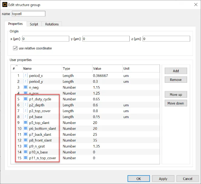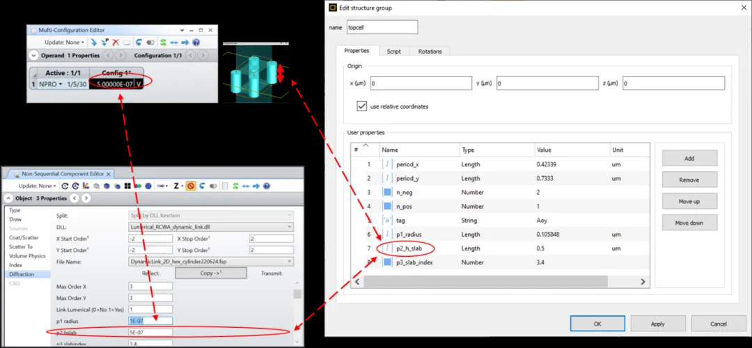 例如,通过右键单击对象树中的顶部单元格,我们可以看到两个光栅文件中存在名称为“p#_*****”的用户属性。这些用户属性将由OpticStudio直接控制。同名的参数将显示在OpticStudio中。用户在OpticStudio中对这些参数的任何修改都将反映到Lumerical中的用户属性中,以更新光栅几何形状。此外,在优化过程中,我们也可以更改一些变量以获得最佳系统性能。