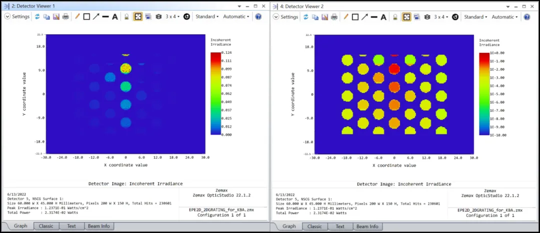 探测器上的光线追踪结果如下。请注意,两张图片显示的结果相同,但右侧是用对数刻度。