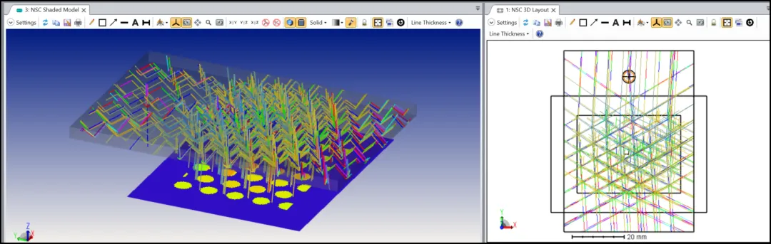 打开这个文件时,我们应该看到两个Lumerical FDTD被打开,只要OpticStudio。这是因为该系统定义了两个光栅。一种是带有圆形区域的一维倾斜光栅,用于在光线中耦合。一种是带有矩形区域的二维六边形光栅,用于耦合光线。