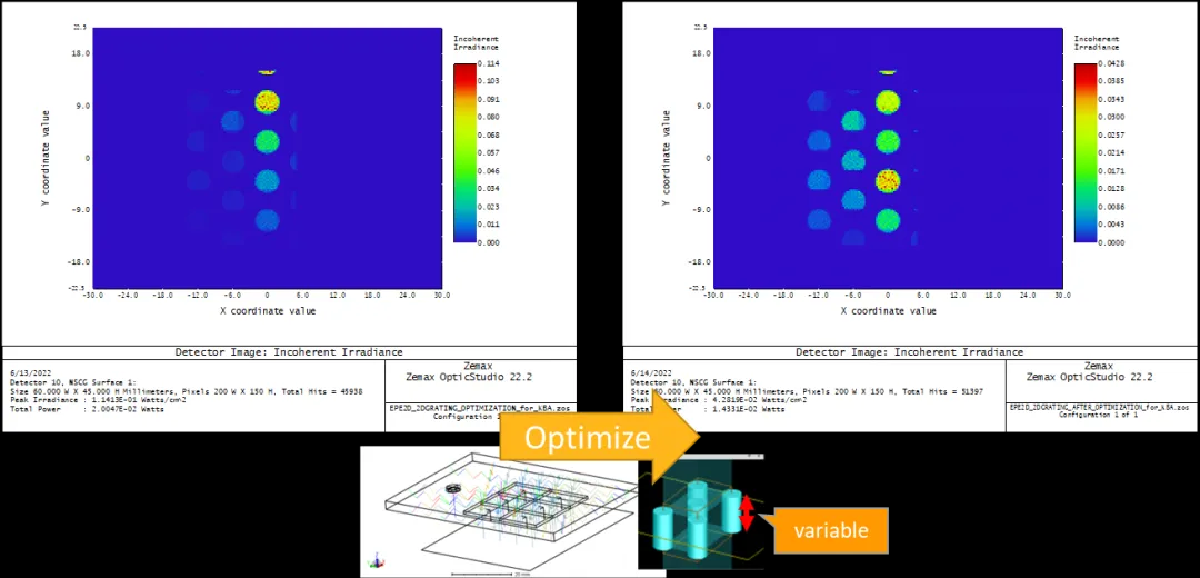 我们可以选择一些参数来优化系统性能。在本演示中,我们将圆柱体高度作为变量,并将中心场的出瞳均匀性作为优化目标。