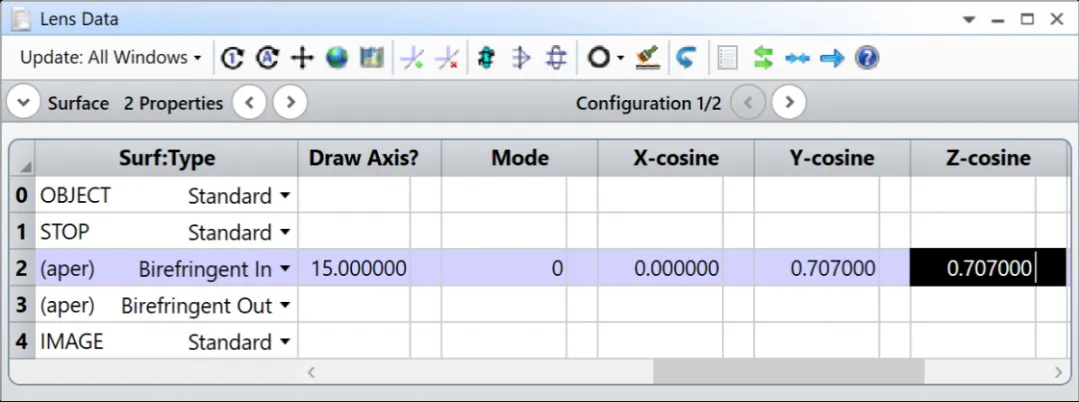 准确的进行双折射光线的追迹要比追迹普通光线复杂的多:我们必须分别考虑寻常光和非寻常光的折射率和波矢方向。因此双折射光线追迹功能只在光线入射到双折射输入 (Birefringent-In) 表面时开始执行,在双折射输出 (Birefringent-Out) 表面结束。并且在双折射输入和双折射输出表面之间只允许存在坐标间断 (Coordinate Break) 表面。