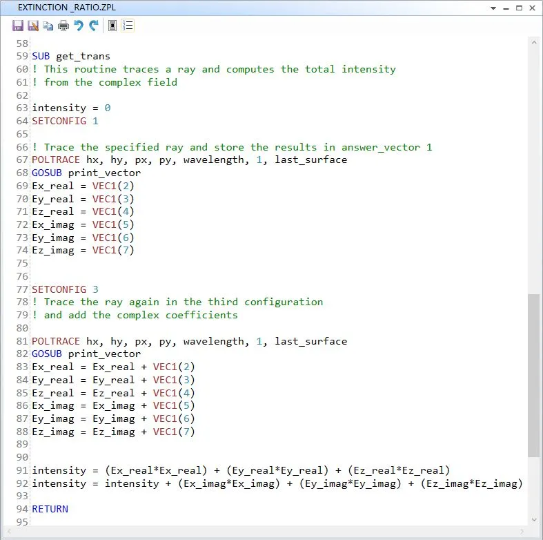 假设我们需要计算偏振光的消光比。如果通过实验的方法进行测量,我们需要使用Y方向偏振的光入射偏振器并测量透过的光强,再计算X方向的偏振光透过的光强并计算两者之比。实际上这也是OpticStudio计算消光比的方式。唯一复杂的点在于透过的光强为两个结构的相干叠加。因此我们需要先计算场振幅的叠加再计算光强。最简便的方法是使用ZPL宏来完成这一计算过程。