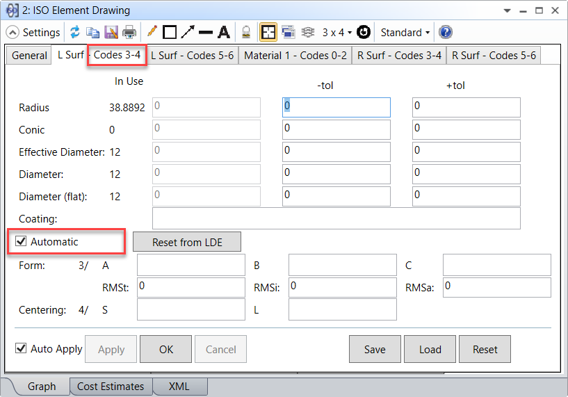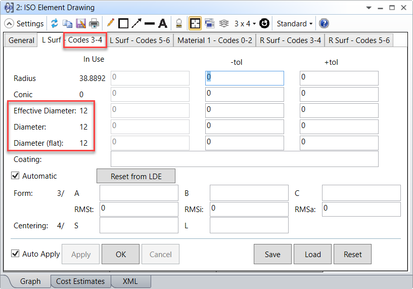 请注意,一些元件特征是在运行该工具时预先填充的,因为在默认情况下,镜头数据编辑器( Lens Data Editor ) 中可用的数据会自动复制到ISO 元件制图中。