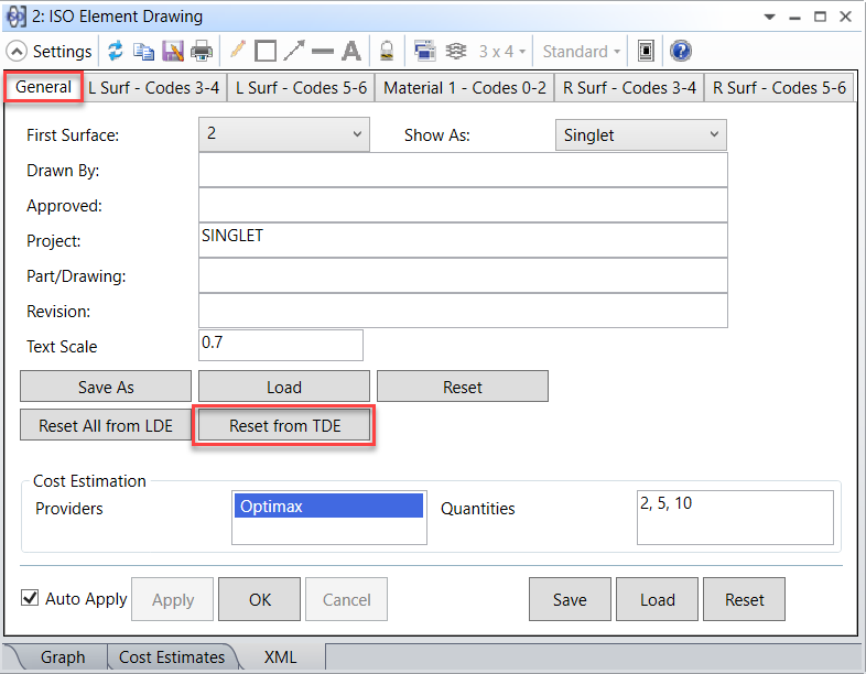 按下“从 TED 重置”时,表面半径、面形、倾斜和偏心、材料厚度和折射率的公差都从公差数据编辑器中导出。注意,只考虑操作数 TRAD、TCUR、TFRN、TCON、TTHI、TIND、TABB、TSTX、TSTY、TSDX、TSDY、TIRR、TEZI 和 TWAV。如果没有某公差项的公差数据,在 ISO 元件制图设置中就会将其设为零,并且不会出现在制图中。