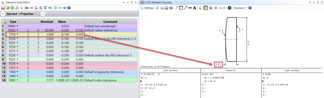 1.TTHI 是厚度公差,因此与表面的相对位置有关,在本例中表示单透镜厚度的公差,在ISO 元件制图的材料选项卡中出现。在输出的图纸中,此公差显示在输出的截面图中,指定了厚度。