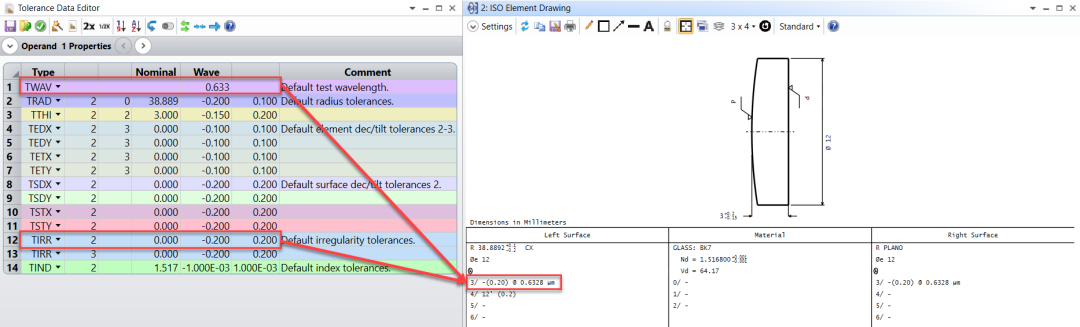 3.TIRR 表示表面不规则度公差,它也出现在 ISO 元件制图的代码 3-4选项卡中。在输出的图纸中,此公差显示在表面属性相关参数的“3/”条目中,它表示面形公差。注意,TIRR操作数是在测试波长(通过 TWAV 操作数指定)下给定的,因此测试波长也与不规则度值相关。