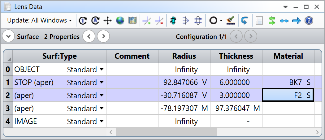 在大约一分钟之后停止优化。LDE中的玻璃可能如下所示: