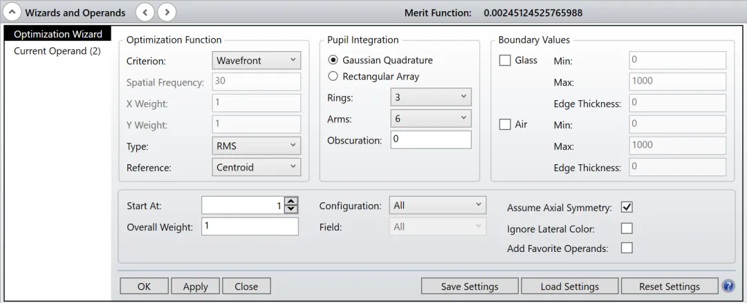 使用评价函数编辑器中的默认评价函数工具构建RMS波前优化默认评价函数。