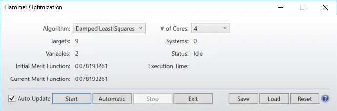 点击“Optimize...Hammer Current”执行Hammer优化。勾选“Auto Update”选项,查看优化期间 LDE 的数据和OPD光扇图的变化。
