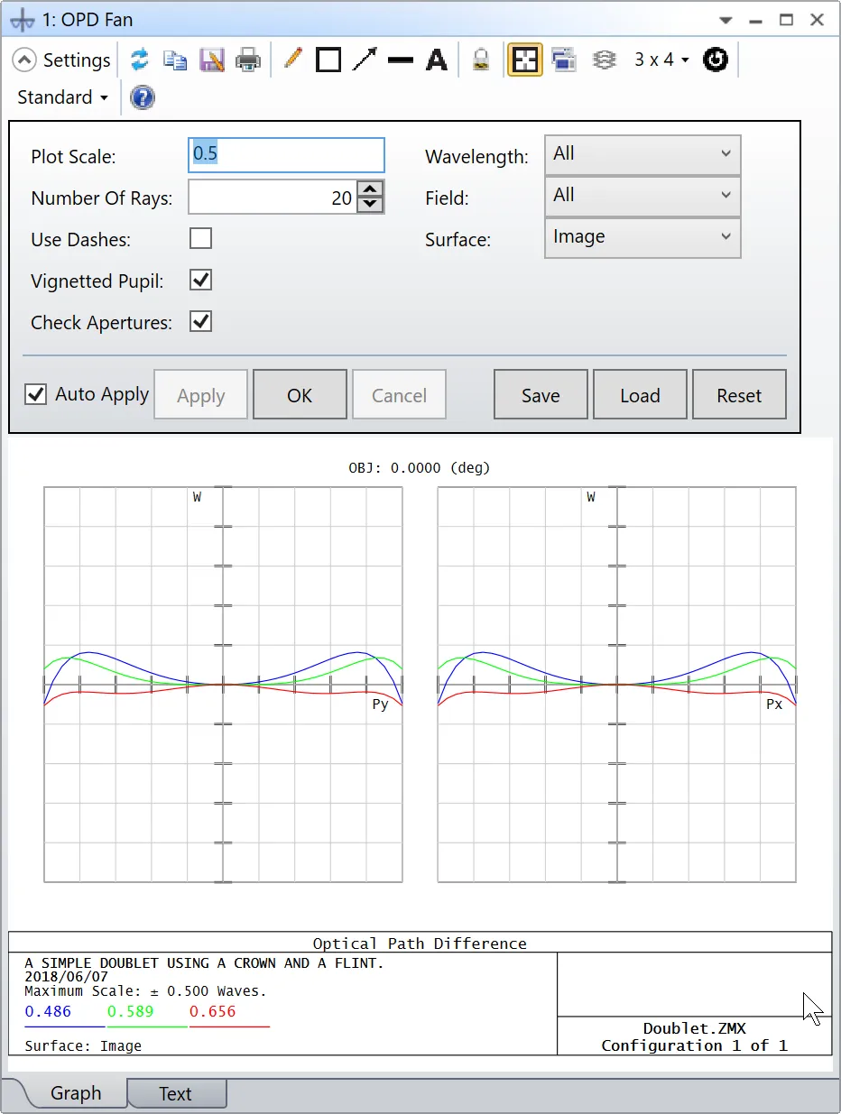 打开OPD光扇图,观察系统在优化之前的性能。OPD最大量度为0.5个波长。
