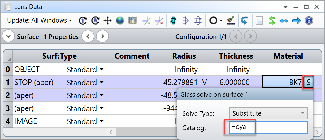 但是您只想使用Hoya目录中的玻璃替换面#1的玻璃,那么您只需要在该玻璃的solve窗口中输入“Hoya”即可。
