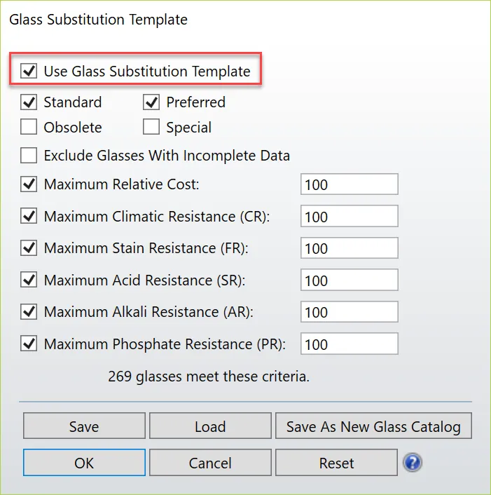 玻璃替换模板使用玻璃目录中的“相对价格 (Relative cost)”和“状态 (Status)”等数据来筛选玻璃。例如,勾选“首选 (Preferred)”选项通常十分有用,因为首选 (Preferred) 的玻璃通常是熔炼更频繁的玻璃,更可能根据需求被供应商提供。