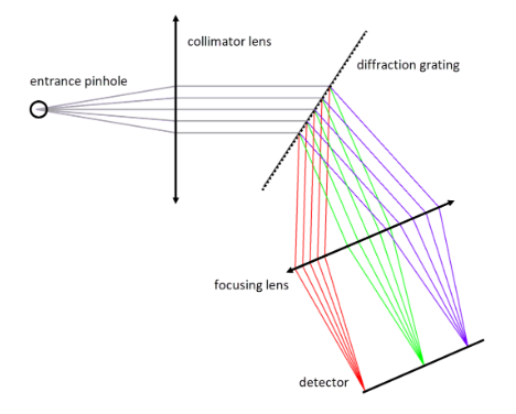 多色光通过入射针孔进入光谱仪,从而产生发散光束。然后,使用准直透镜生成平行光线。后面的透射式衍射光栅是光谱仪的核心元件,它可以根据光束的波长(即颜色)改变光束的方向。最后,聚焦透镜将光束会聚在探测器上。每种波长的光线会聚在探测器上不同的位置,通过将测量到的强度作为探测器上位置的函数,可以得到光线的光谱。