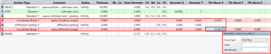 本文示例中假设d = 0.5µm ,可得:α= 33.367°。考虑到这一点,我们在OpticStudio中设置了衍射光栅。首先,在镜头文件中引入坐标断点,并将倾斜X ( Tilt About X )设置为33.367°,以使光线倾斜度与入射角大小相同。在下一行添加衍射光栅 ( Diffraction Grating ),设置刻线/µm(Line/µm) (d的倒数)为2,并将衍射级次设为 -1。需要另一个坐标断点来达到衍射角的参数需求。此处,在倾斜X上设置主光线 ( Chief Ray ) 求解,使坐标自动跟随主波长: