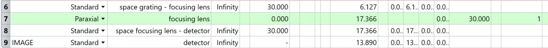光谱仪的最后一组元件是聚焦透镜和探测器。我们在镜头文件中添加了四行,分别为:光栅和聚焦透镜之间的距离(30 mm),近轴聚焦透镜(焦距ff = 30 mm ),用来满足焦距的空间和探测器平面: