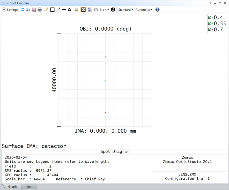 现在已经完成了近轴LGL光谱仪的设计,打开标准点列图 ( Standard Spot Diagram ) 来查看最初选择的三个波长在像面上 (即探测器上)的光斑大小: