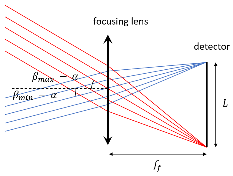 之前考虑的重要结果:一旦定义了光谱仪的带宽,衍射光栅产生的最小和最大折射角度就确定了(公式1)。最小和最大衍射角与聚焦透镜的焦距ff一同定义了探测器宽度(公式2)。大尺寸探测器需要较大ff ,反之亦然。