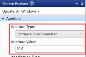 首先,在系统选项 ( System Explorer ) 中设置系统的基本参数。按照下图设置入瞳直径 ( Entrance Pupil Diameter ) (稍后将看到孔径如何影响光谱仪的性能):