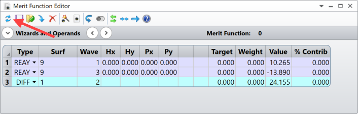 更复杂和精确的方法是使用操作数。为此,打开评价函数编辑器 ( Merit Function Editor ),输入以下内容并更新窗口(点击红色箭头所指按钮):